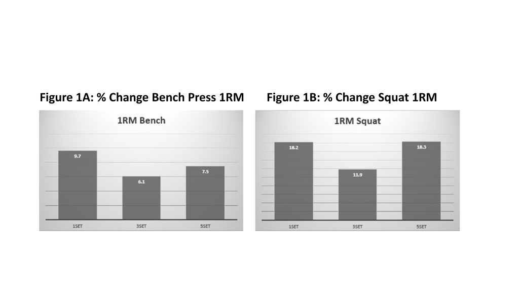 I guadagni di forza nel gruppo da 1 set erano altrettanto buoni come per i gruppi a volume più alto (vedi Figura 1). Inoltre, questi risultati sono stati raggiunti in una frazione del tempo in rapporto alle routine con volume più elevato poiché il gruppo da 1 set si è allenato per circa 13 minuti a sessione mentre le sessioni del gruppo a 5 set sono durate circa 68 minuti! Quindi, una conclusione importante sarebbe che, se aumentare la forza è l’obiettivo principale, è possibile adottare vantaggiosamente un approccio di allenamento a basso volume e alta intensità raggiungendo il risultato prefissato in meno di 45 minuti a settimana. Ora questa osservazione necessita di una precisazione: l’allenamento è stato effettuato in un intervallo di ripetizioni moderato (8-12 RM). Direi che se usassimo un vero range da powerlifting (3-5 RM), probabilmente si dovrebbero aggiungere alcune serie addizionali poiché il basso numero di ripetizioni per serie limiterebbe la quantità di “stimolo” e quindi richiederebbe un volume più alto.