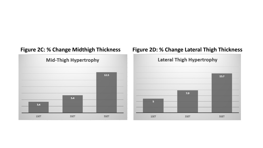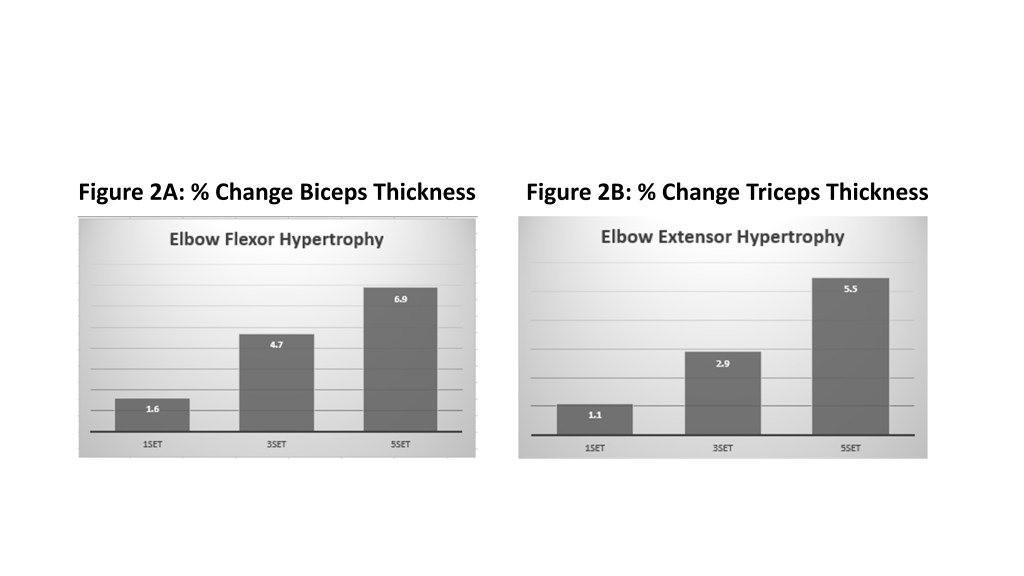 In alternativa, c’era una chiara relazione dose-risposta per l’ipertrofia muscolare, con 5 serie che mostravano i maggiori guadagni, seguite da 3 serie e poi 1 serie. Questi risultati erano generalmente coerenti per tutti i muscoli studiati ed erano più pronunciati nella muscolatura inferiore del corpo. Il grafico seguente presenta una rappresentazione visiva dei risultati.