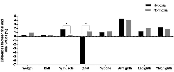 Il gruppo allenato in ambiente ipossico aveva perso 630g di grasso corporeo, mentre il gruppo normo-ossigeno aveva perso 270g di grasso. Il gruppo ipossia aveva ottenuto 760g di massa corporea magra, mentre il gruppo normo-ossigeno ne aveva guadagnati 520g.