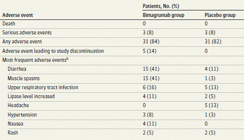 L’inibitore della Miostatina non è risultato privo di effetti collaterali. Ogni 10 partecipanti allo studio che avevano ricevuto il Bimagrumab, 4 manifestarono diarrea. Un numero uguale di partecipanti allo studio ha riportato spasmi muscolari.