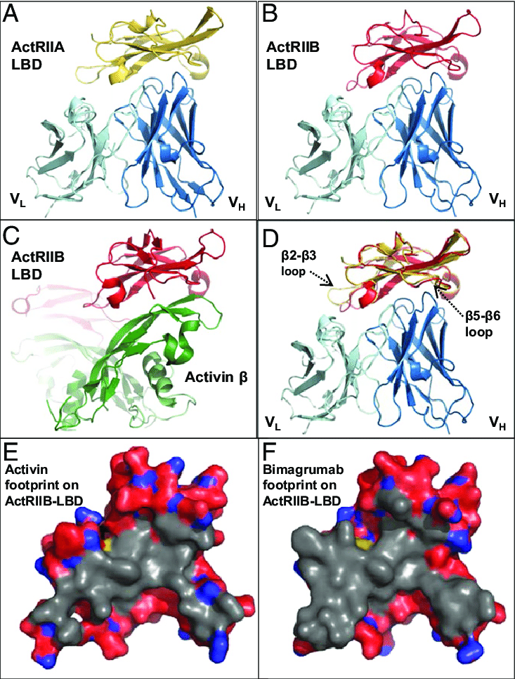 Modalità di legame del bimagrumab con ActRIIA e ActRIIB. Strutture cristalline del complesso bimagrumab Fv (nastro blu chiaro / scuro) con (A) ActRIIA umana LBD (nastro dorato) o (B) ActRIIB LBD umano (nastro rosso), mostrate nello stesso orientamento. (C) Struttura cristallina del complesso ActRIIB LBD di topo con activin-β umana (file PDB 1S4Y) (35), mostrato con lo stesso orientamento di A, B e D. (D) Sovrapposizione del complesso ActRIIA Fv (oro nastro) e complesso ActRIIB Fv (nastro rosso). (E) Impronta di activin (superficie grigia, calcolata dall’archivio PDB 1S4Y) e (F) Bimagrumab su ActRIIB LBD. Notare l’ampia sovrapposizione tra le due superfici di rilegatura.
