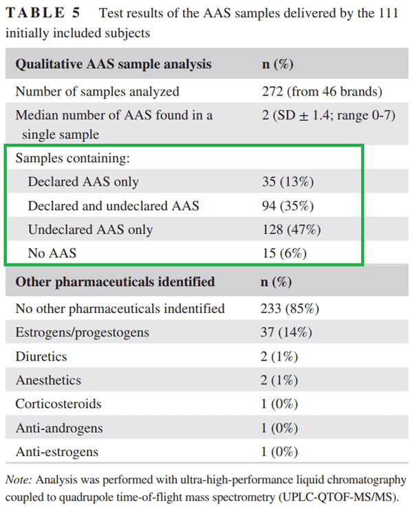 Un recente studio condotto dalla clinica ambulatoriale per utilizzatori di steroidi anabolizzanti nei Paesi Bassi ha esaminato 272 campioni di AAS di 46 diversi marchi forniti loro da i soggetti che si sono arruolati nella loro sperimentazione clinica [23]. I risultati possono essere trovati nella tabella tratta dal documento qui sotto:
