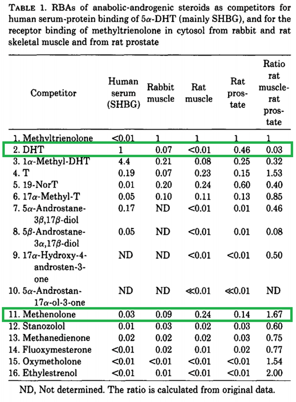Infine, ovviamente, i ratti non sono esseri umani. È un altro enorme presupposto che i tessuti omologhi negli esseri umani risponderebbero allo stesso modo ad un AAS come osservato nel ratto. Nessun valore deve essere attribuito ai rapporti provenienti dal dosaggio Hershberger. Un altro metodo consiste nel misurare l’affinità di legame relativa di uno steroide in vari tessuti. Saartok et al. ha utilizzato questo metodo determinando l’affinità di legame relativa del Methenolone nel muscolo del coniglio, nel muscolo del ratto e nella prostata del ratto, rispetto al composto di riferimento (Methyltrienolone) [18]. Gli autori erano consapevoli dei problemi con il muscolo bulbocavernoso e, di conseguenza, sembra che abbiano utilizzato i muscoli soleo e gastrocnemio. I risultati sono stati i seguenti: