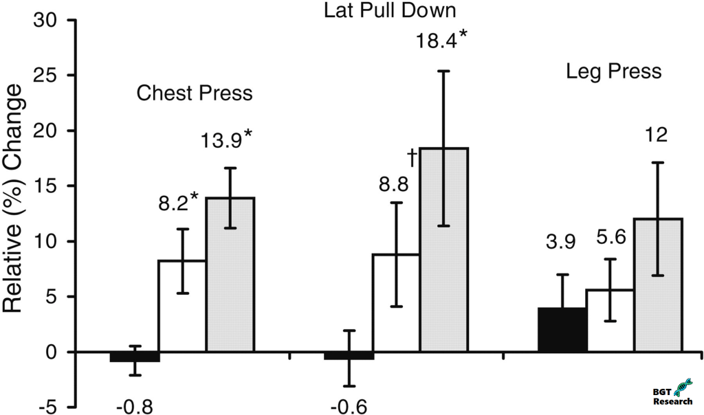 Al contrario, c’erano guadagni non significativi tra i tre gruppi di trattamento per la forza degli arti inferiori (3,9-12,0%), coerentemente con la mancanza di un aumento significativo della massa magra degli arti inferiori mediante scansione DEXA. Tuttavia, c’era una differenza quasi significativa (P = 0,052) tra i gruppi per il cambiamento del area della sezione trasversale del muscolo (CSA) dei muscoli della coscia tramite la risonanza magnetica, suggerendo che la terapia dello studio può aver influenzato positivamente i muscoli degli arti inferiori. È possibile che i test di forza di gruppi muscolari multipli e di grandi dimensioni, come quelli utilizzati con l’esercizio Leg Press, siano meno sensibili ai modesti cambiamenti nella massa muscolare, e lo studio potrebbe non aver avuto sufficiente potenza per rilevare piccoli ma significativi guadagni nelle estremità inferiori. Si ipotizza che ciò sia dovuto al fatto che i grandi muscoli delle gambe sono abitualmente utilizzati più frequentemente per sostenere il carico (ad esempio, camminare, alzarsi da una sedia) rispetto ai muscoli dell’estremità superiore negli adulti più anziani. Piccoli ma significativi guadagni nella forza e nella massa muscolare della parte inferiore del corpo possono essere meno dimostrabili che per i muscoli della parte superiore del corpo, che possono essere utilizzati meno per il lavoro ad alto volume e più inclini alla sarcopenia nelle persone anziane. Inoltre, i muscoli degli arti superiori, rispetto ai muscoli degli arti inferiori, hanno proporzioni maggiori di fibre a contrazione rapida di tipo II, che possono essere perse preferibilmente con l’invecchiamento. Inoltre, uno studio longitudinale in uomini anziani ha mostrato che le fibre di tipo I sono state perse principalmente nel vasto laterale della gamba, portando all’ipotesi che ci potrebbe essere una maggiore perdita di fibre di tipo II nelle braccia con l’invecchiamento. Così la risposta agli stimoli anabolici può essere più facilmente dimostrabile nelle estremità superiori di questa popolazione.