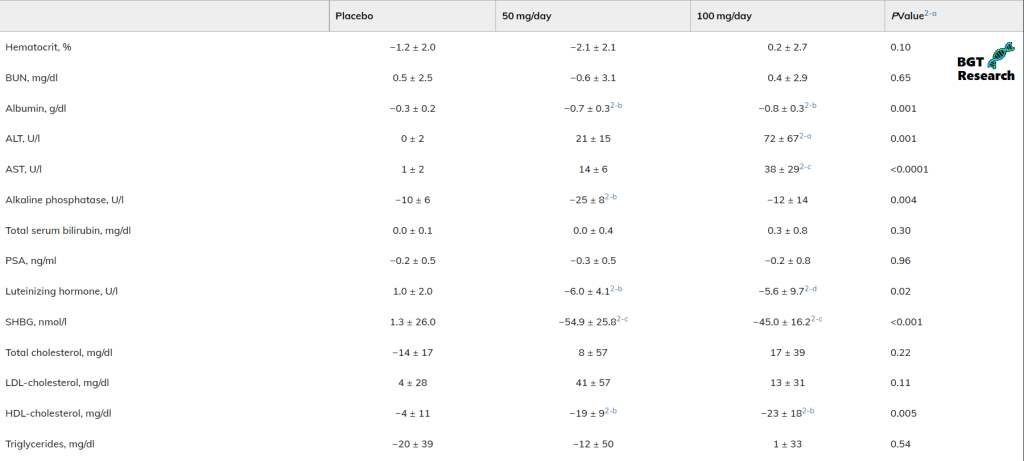 Se si confrontano i biomarcatori tra i due gruppi, è possibile vedere che l’effetto di 100mg di Oxymetholone ha avuto sui livelli di ALT e AST era molto più deleterio rispetto al gruppo di 50 mg.