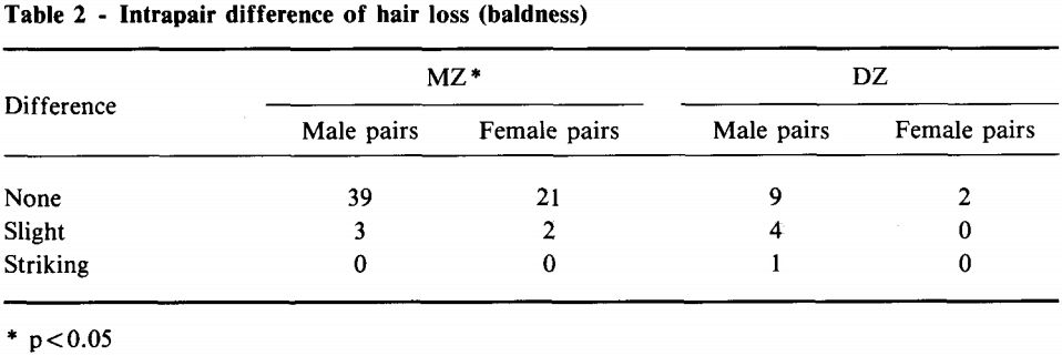 Come si può vedere nella tabella, la differenza era praticamente inesistente in quasi tutte le coppie monozigoti, mentre lievi differenze potevano essere osservate più frequentemente nei gemelli dizigoti, e persino una differenza eclatante in una coppia. Per esprimere questo dato in numeri, gli autori hanno calcolato il tasso di concordanza intracoppia. Si tratta di un termine elegante per indicare la percentuale di identità di un tratto tra i gemelli. Il tasso di concordanza intracoppia sulla perdita di capelli è stato del 92,3% nelle coppie monozigoti e del 68,7% nelle coppie dizigoti. Poiché le coppie monozigoti hanno geni praticamente identici, mentre le coppie dizigoti condividono solo il 50%, ciò implica una notevole componente genetica nello sviluppo della caduta dei capelli. Diciamo che il termine androgenetico in alopecia androgenetica è giustificato.