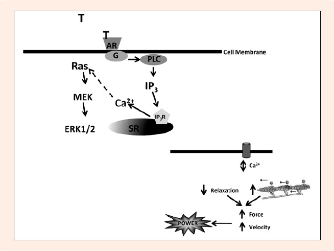 Il Testosterone (T) si lega a un recettore androgeno (AR) situato sulla membrana cellulare, accoppiato a una proteina G sensibile al PTX che attiva la fosfolipasi C (PLC). Questa a sua volta aumenta i livelli di IP3, che vengono liberati e diffusi ai recettori (IP3R) sul reticolo sarcoplasmatico (SR). Questo aumenta a sua volta i livelli di calcio intracellulare attraverso il rilascio di calcio dal SR. È possibile che si verifichi un’attivazione indotta dal calcio della cascata di fosforilazione Ras/ERK, con conseguente trascrizione del DNA, che viene poi espresso sotto forma di proteine.