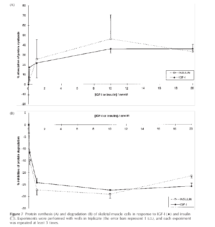 È stato dimostrato che l’IGF-1 inibisce allo stesso modo la disgregazione proteica a livello sistemico [Fryburg DA et al.1994], il che avrebbe senso a causa della stretta correlazione con il GH. Quando gli amminoacidi e l’Insulina vengono somministrati ai soggetti esaminati, già sottoposti a somministrazione di IGF-1, è stato dimostrato, sia negli uomini che negli animali, che i tassi di sintesi proteica aumentano a livello sistemico [Jacob R et al.1996]. Vale la pena notare che l’IGF-1 è bifasico nel senso che quando è somministrato ad alto dosaggio e, di conseguenza, i livelli serici diventano elevati, il suo comportamento cambia passando da un azione “GH-simile” ad una “insulino-simile”.