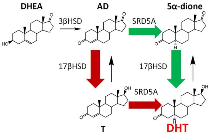Nota: sebbene in genere si pensasse che il percorso dai precursori steroidei surrenalici (vedi DHEA>Androstenedione>Testosterone>DHT) al DHT richiedesse la 5α-riduzione del Testosterone, dati recenti suggeriscono che esso comporti invece la conversione del Δ4-androstenedione da parte dell’isoenzima-1 SRD5A in 5α-androstanedione, seguita dalla successiva conversione in DHT. La via del 5α-androstenedione verso il DHT bypassa quindi completamente il Testosterone.