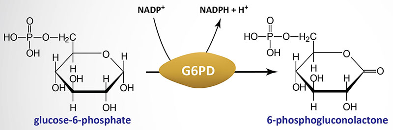 La glucosio-6-fosfato deidrogenasi è l’enzima che catalizza la prima reazione della via dei pentoso fosfati: D-glucosio 6-fosfato + NADP⁺ ⇄ D-glucono-1,5-lattone 6-fosfato + NADPH + H⁺. Tale reazione è la prima della via dei pentoso fosfati.