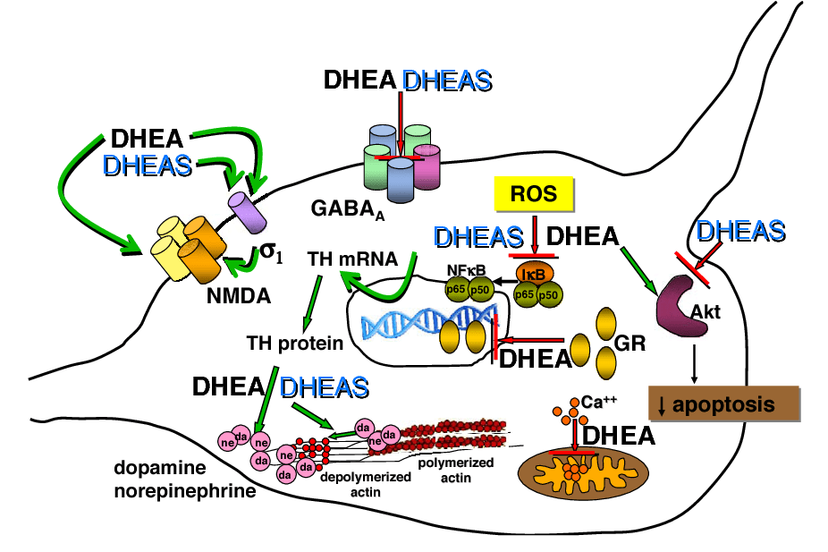 Meccanismi d’azione del DHEA e del DHEAS nei neuroni. Questa vignetta riassume molte delle azioni del DHEA e del DHEAS descritte nel testo. Il DHEA e il DHEAS hanno effetti inibitori (freccia rossa di blocco) sul recettore GABAA. Il DHEA e il DHEAS agiscono come agonisti (freccia verde) sul recettore r1, che successivamente può attivare il recettore NMDA. Il DHEA inibisce l’afflusso di Ca2+ (freccia rossa di blocco) nei mitocondri. Il DHEA influenza la crescita dei neuriti embrionali attraverso la stimolazione (freccia verde) del recettore NMDA. Il DHEA aumenta (freccia verde) l’attività chinasica di Akt e diminuisce l’apoptosi, mentre il DHEAS diminuisce (freccia rossa di blocco) Akt e aumenta l’apoptosi. Il DHEAS aumenta (frecce verdi) l’mRNA del TH e l’abbondanza della proteina TH, portando a un aumento della sintesi di catecolamine. Il DHEA e il DHEAS stimolano (frecce verdi) la depolimerizzazione dell’actina e lo smontaggio dei filamenti di actina sottomembrana e (frecce verdi), aumentando la secrezione di catecolamine (‘da’ e ‘ne’) dalle vescicole secretorie. Il DHEA e il DHEAS inibiscono (freccia rossa di blocco) l’attivazione delle specie reattive dell’ossigeno (ROS) della trascrizione mediata da NF-jB. Il DHEA inibisce (freccia rossa di blocco) la traslocazione nucleare del recettore dei glucocorticoidi (GR). Meccanismi d’azione non rappresentati in questo grafico sono: alterazioni della sintesi del fattore neurotrofico di derivazione cerebrale (BDNF), inibizione della traslocazione della proteina chinasi 3 attivata dallo stress (SAPK3) e inibizione dell’attività della 11b-idrossisteroide deidrogenasi di tipo 1 (11b-HSD1). Abbreviazioni: r1, recettore sigma 1; Akt, protein chinasi serina-treonina Akt; Ca2+, calcio; da, dopamina; GABAA, recettore dell’acido c-aminobutirrico di tipo A; GR, recettore dei glucocorticoidi; ne, noradrenalina; NF-jB, fattore nucleare kappa B; NMDA, recettore del N-metil-D-aspartato; ROS, specie reattive dell’ossigeno; TH, tirosina idrossilasi.