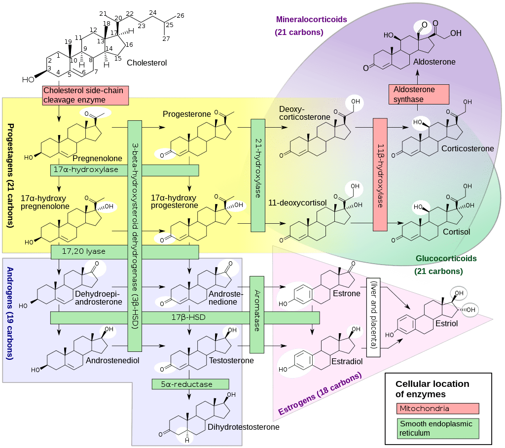 Nell’immagine si possono vedere gli enzimi, la loro localizzazione cellulare, i substrati e i prodotti della steroidogenesi umana. Vengono inoltre illustrate le principali classi di ormoni steroidei: progestageni, mineralocorticoidi, glucocorticoidi, androgeni ed estrogeni. Tuttavia, esse si sovrappongono in parte, ad esempio i mineralocorticoidi e i glucocorticoidi. I cerchi bianchi indicano i cambiamenti nella struttura molecolare rispetto ai precursori.