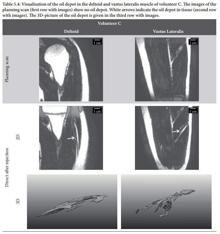 Da quanto detto è facile capire come l’esterificazione ha il potenziale per estendere notevolmente l’emivita di un AAS. Il Testosterone esterificato (o qualsiasi altro tipo di steroide) viene solubilizzato nell’olio. Questo olio viene quindi iniettato per via intramuscolare in cui si diffonderà per tutta la lunghezza dei fasci muscolari. Questo appare come segue nell’immagine (notare come l’olio si diffonde lungo la lunghezza dei fasci muscolari):