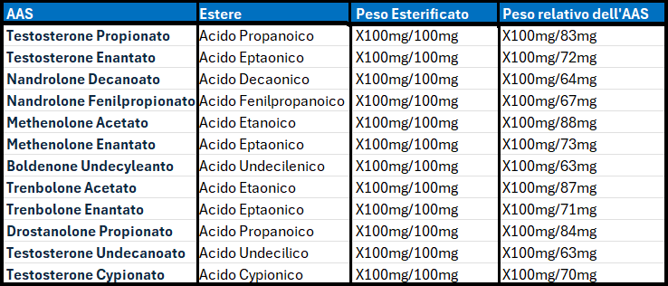 Un altro aspetto poco compreso riguarda il peso molecolare dell’AAS privo dell’Estere. Questo dettaglio non è di poca importanza dal momento che ci indica quanto principio attivo effettivamente si trova in un dato dosaggio di un dato AAS esterificato.